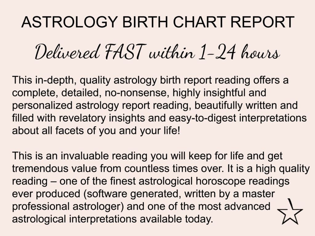 This in-depth astrology birth report reading offers a complete, detailed, no-nonsense, highly insightful and personalized astrology report reading, beautifully written and filled with revelatory insights and easy-to-digest interpretations about all facets of you and your life!