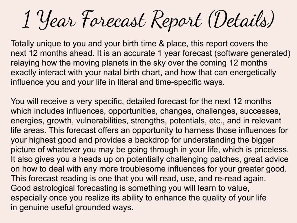 This is totally unique to you and your birth time/place and covers the next 12 months ahead looking at your astrological transits. It is an uncannily accurate 1 year forecast (software generated) relaying how the moving planets in the sky over the coming 12 months exactly interact with your natal birth chart, and how that can energetically influence you and your life in literal and time-specific ways.